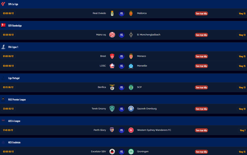 Trang web này không chỉ liệt kê trận đấu, mà còn sắp xếp lịch theo dòng thời gian chuẩn, phân theo: