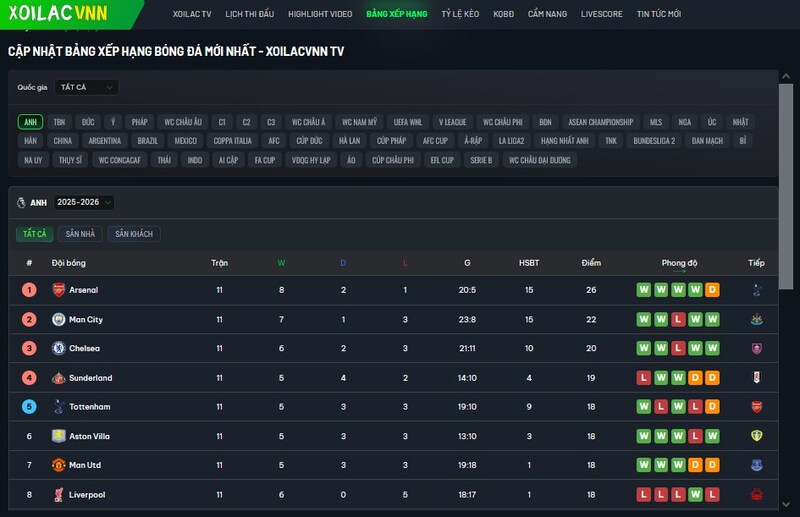 Trang cũng cung cấp bảng xếp hạng chi tiết của các giải lớn, đặc biệt là bảng xếp hạng bóng đá ngoại hạng anh. Từ điểm số, số trận thắng – hòa – thua cho đến hiệu số bàn thắng, thông tin đều được hiển thị rõ ràng.